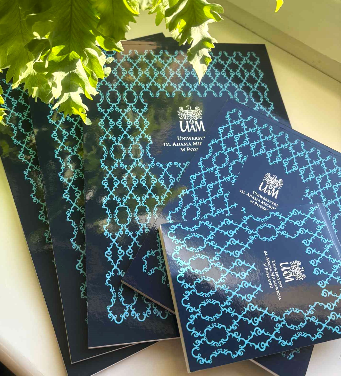 Notes duży A4 w kratkę z kropek z logotypem UAM, w nowej kolekcji rektorskiej Ornamenta. Okładka laminowana folią połysk.