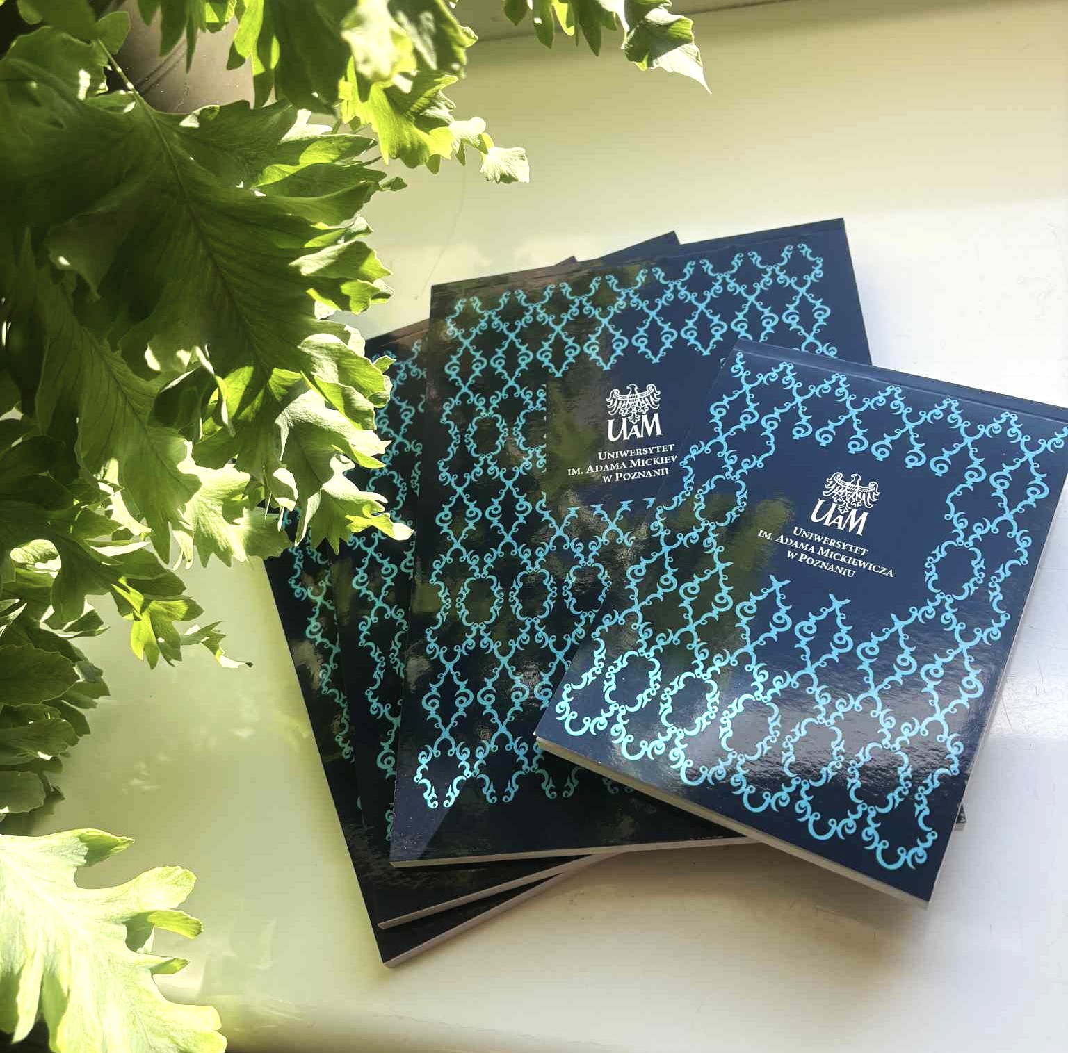 Notes A5 w kratkę z kropek z logotypem UAM, w nowej kolekcji rektorskiej Ornamenta. Okładka laminowana folią połysk.